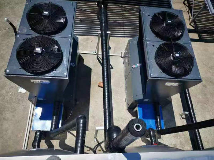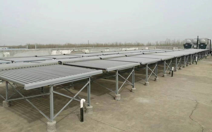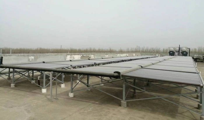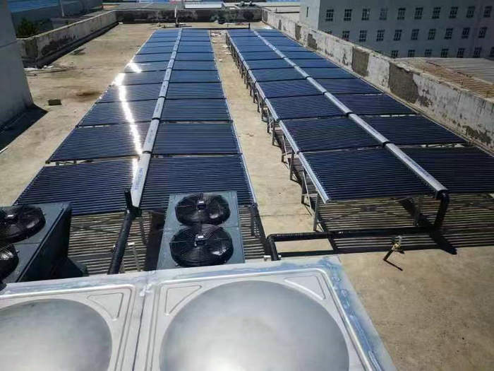天津东马圈雍福悦园区工厂宿舍热水系统为12吨的热水项目:采用了两台10P茄子视频APP官网低温机(ZN-DKFDX-120ll)十24组太阳能集热器(58*1800*50)+12吨方形不锈钢热水保温水箱。